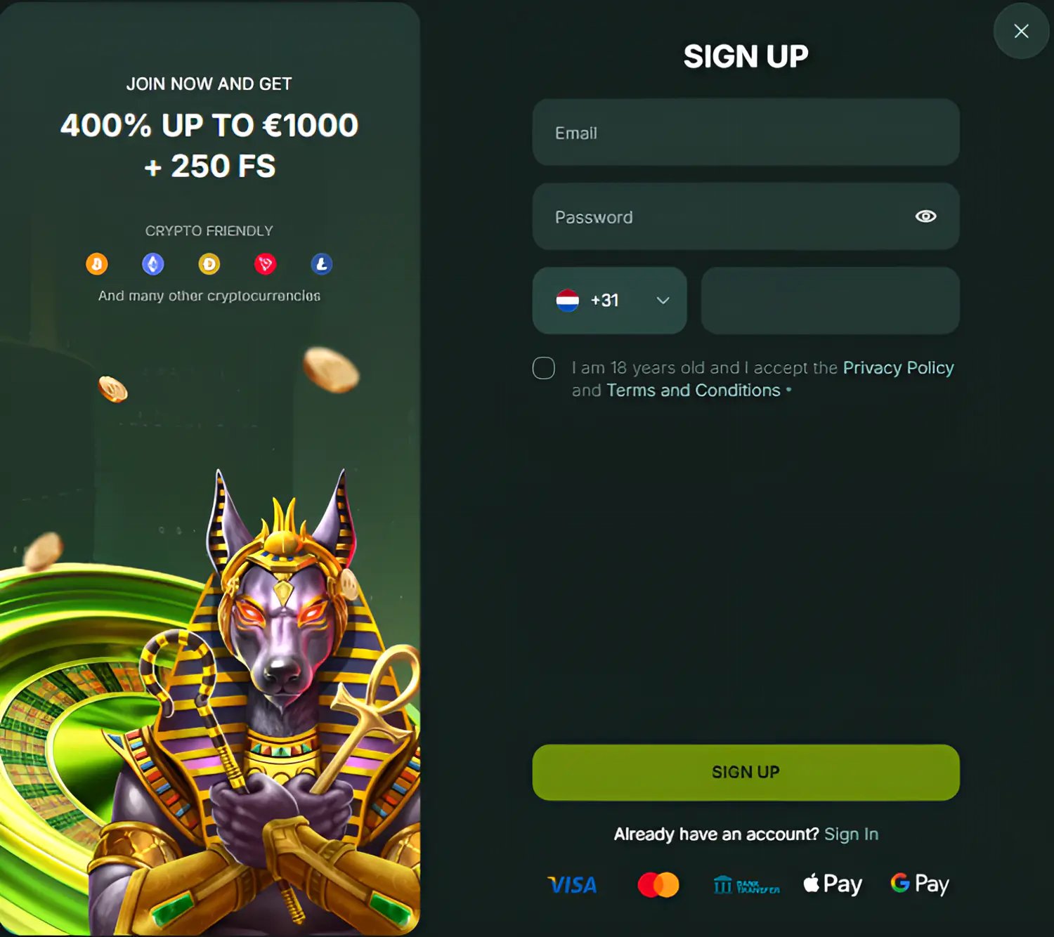 - Log in via de ‘Sign in’ knop en maak je eerste storting om te profiteren van het welkomstpakket met bonussen en free spins.
